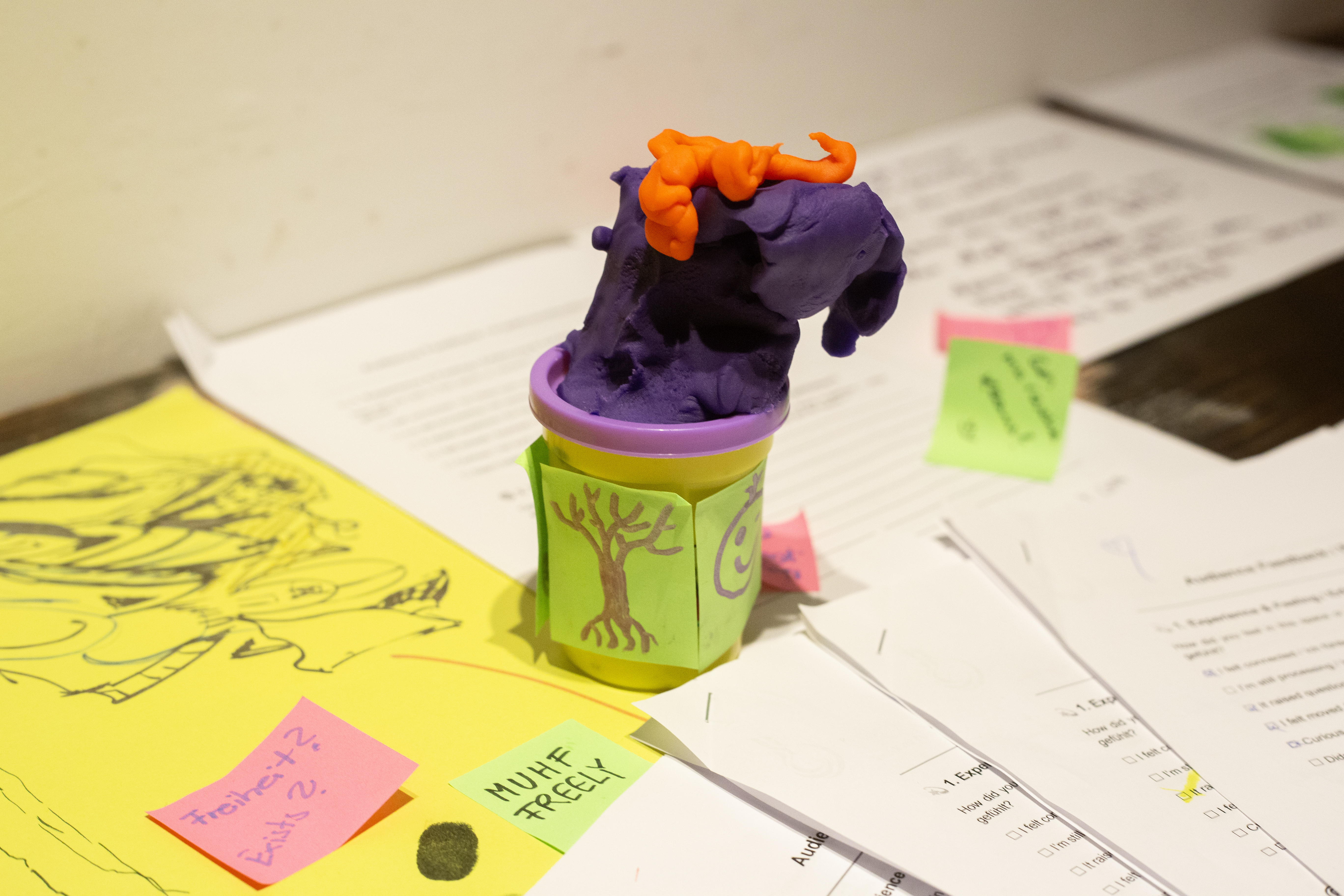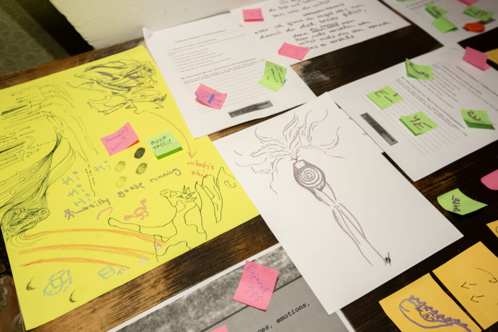 They serve as both research and community participation — written thoughts transforming into movement, poetry, or sound during later performances.